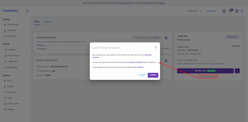 Clockdiary gives you the flexibility to cancel your paid subscription anytime. Whether your team is scaling down or you simply want to switch back to the Free Plan, the process is simple and transparent.